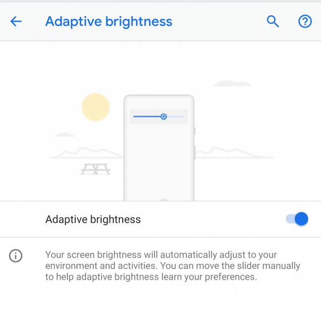Была изменена работа яркости. Она меняется автоматически и работает вполне точно. Если зайти в тёмную комнату, система автоматически снизит уровень яркости почти до минимума. Если выйти на свет, яркость экрана увеличится. Можно наблюдать за этим, если оставить панель быстрых настроек открытой, там ползунок яркости будет сам перемещаться в нужном направлении. При переходе в темноту ползунок быстро соскальзывает до 10% и в течение следующих нескольких секунд становится ещё темнее, словно давая глазам время на привыкание.