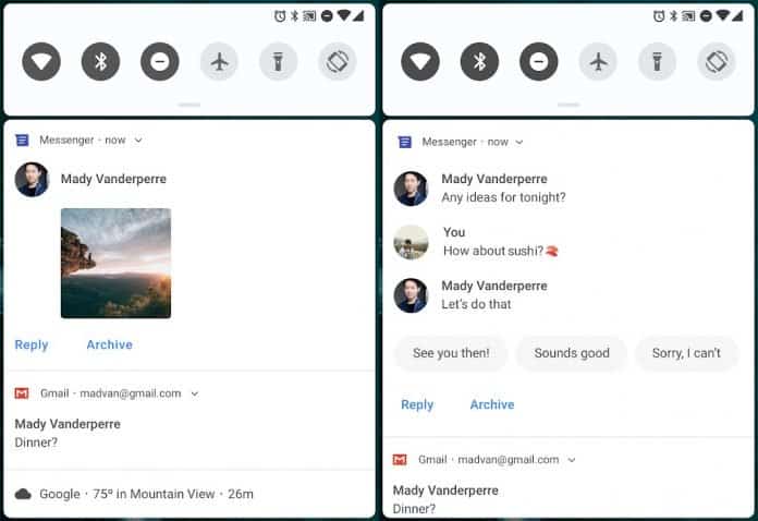 Пользователи Android P в первую очередь могут обратить внимание на панель навигации, внешний вид которой изменился. Ранее попавшие в сеть изображения оказались не совсем правильными. На них не было даты и времени, на самом же деле они находятся в панели статуса. В конечном счёте панель уведомлений получит поддержку умных ответов. Это кастомные ответы на сообщения с применением алгоритмов машинного обучения Google. Пока данная функциональность не работает.