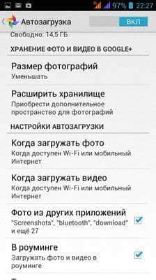 - Запускаем Google Photo и в настройках активируем автозагрузку. Также здесь можно указать, когда именно производить синхронизацию (например, только по Wi-Fi).