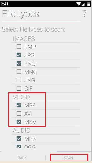- Отметьте типы файлов, которые утилита будет искать на устройстве (MP4, AVI, MKV), и нажмите «Сканировать».