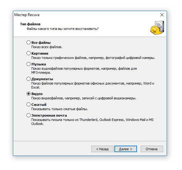 - Запускаем Recuva и в начальном окне указываем тип данных, которые нужно восстановить. Здесь можно выбрать не только видео, но и музыку, фотки, текст и многое другое. Если вы отметите пункт «Все файлы», то программа будет искать всю стертую с гаджета информацию. Восстанавливая все данные, вы значительно увеличите время реанимирования.