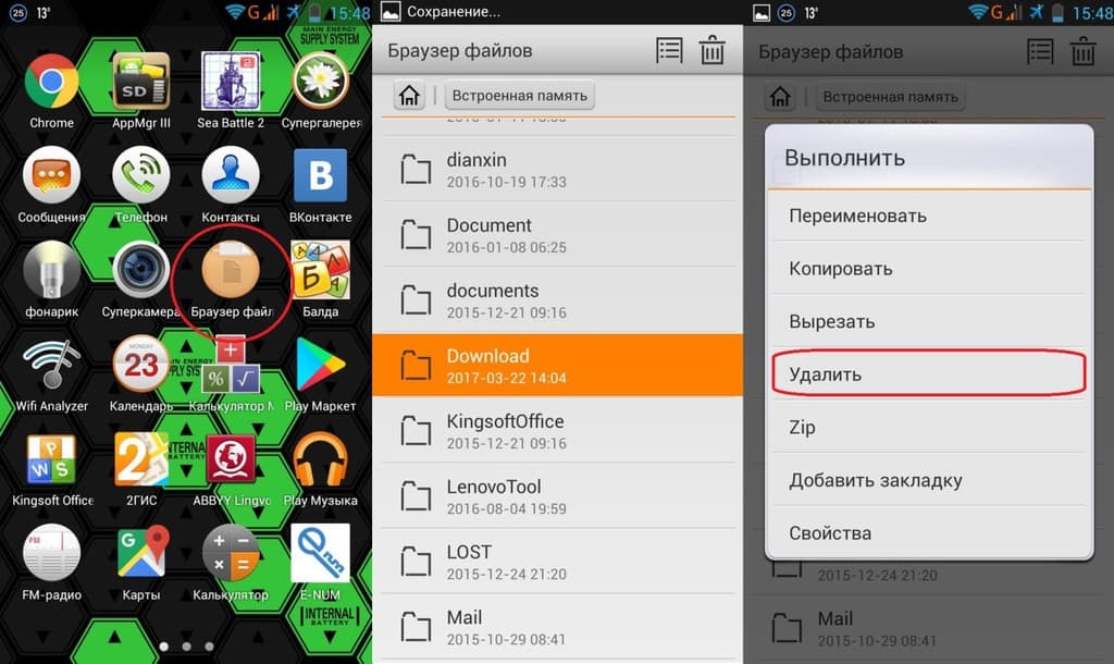 В каждом смартфоне есть собственный проводник (встроенный браузер файлов). Если вам удалось достоверно определить, какой файл является зараженным, можете удалить его вручную. Запустите проводник, найдите на системной памяти этот файл или папку. Далее нажмите функциональную клавишу смартфона и выберите пункт удалить.