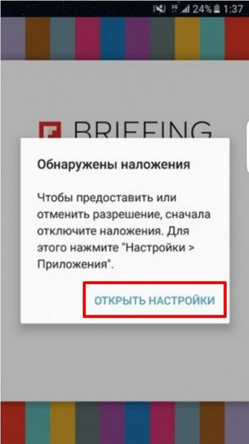 Появление сообщений о наложениях возникло только в Android 6. Обычная попытка установить права программе при наличии нескольких активных окон одновременно вызывает появление ошибки. Не все окна видны на рабочем столе, найти или закрыть их сложно.